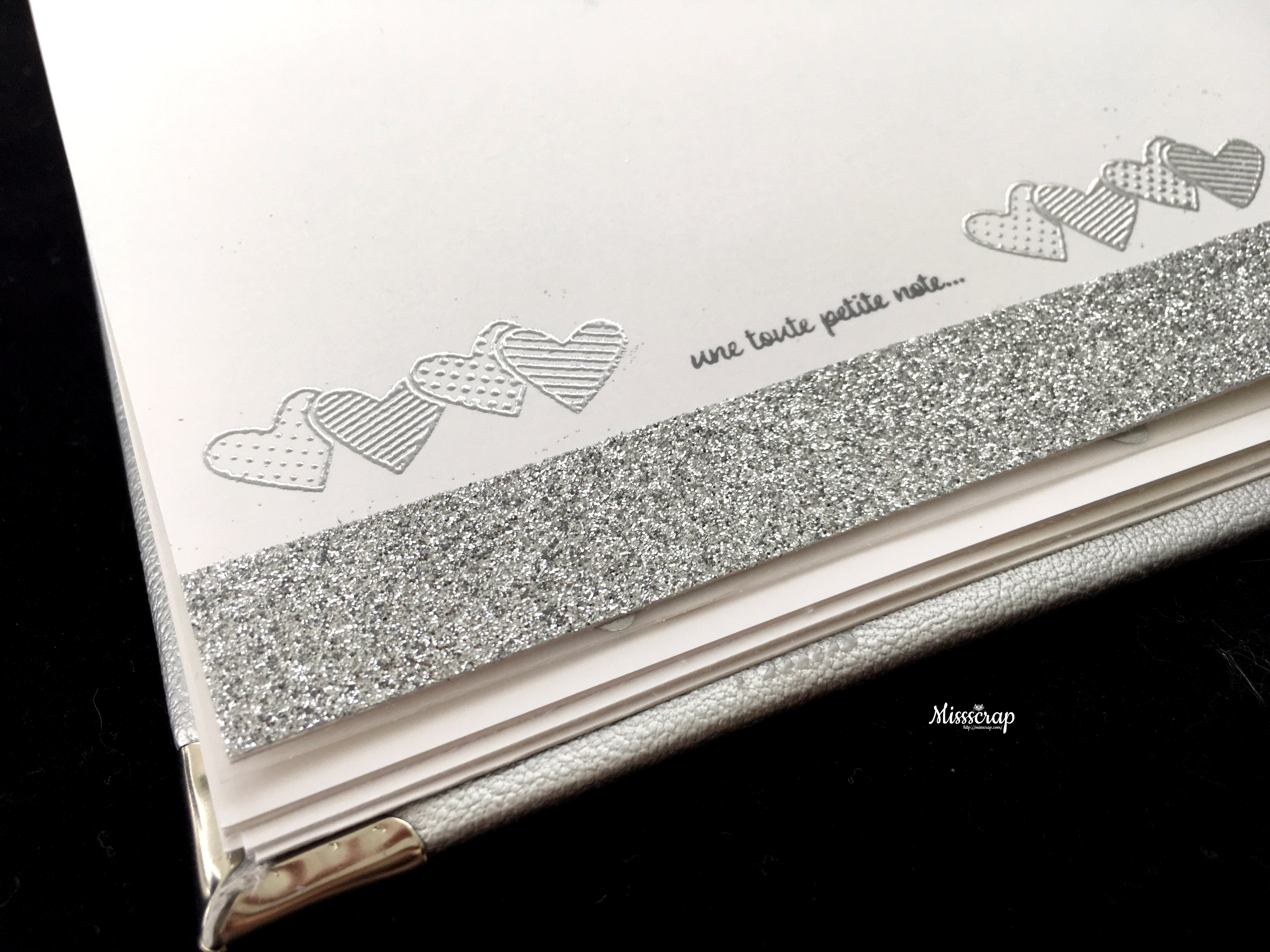 J’ai donc travaillé toutes les pages avec de la poudre à embosser Stampin’up argenté et j’ai mixé nos tampons avec ceux d’autres marques pour un bel effet harmonieux.