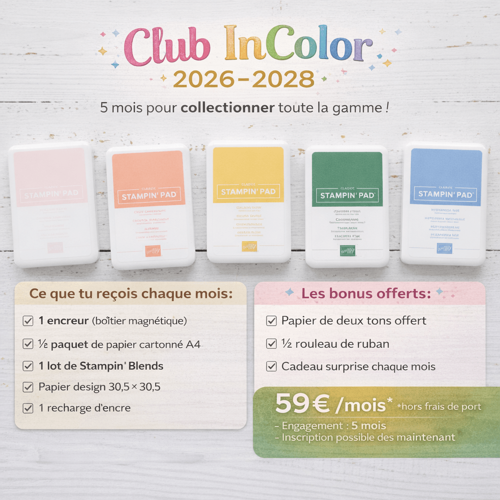 Chaque mois, tu reçois une sélection de produits coordonnés dans une des nouvelles couleurs : papiers, embellissements, rubans… de quoi créer facilement sans te poser de questions.