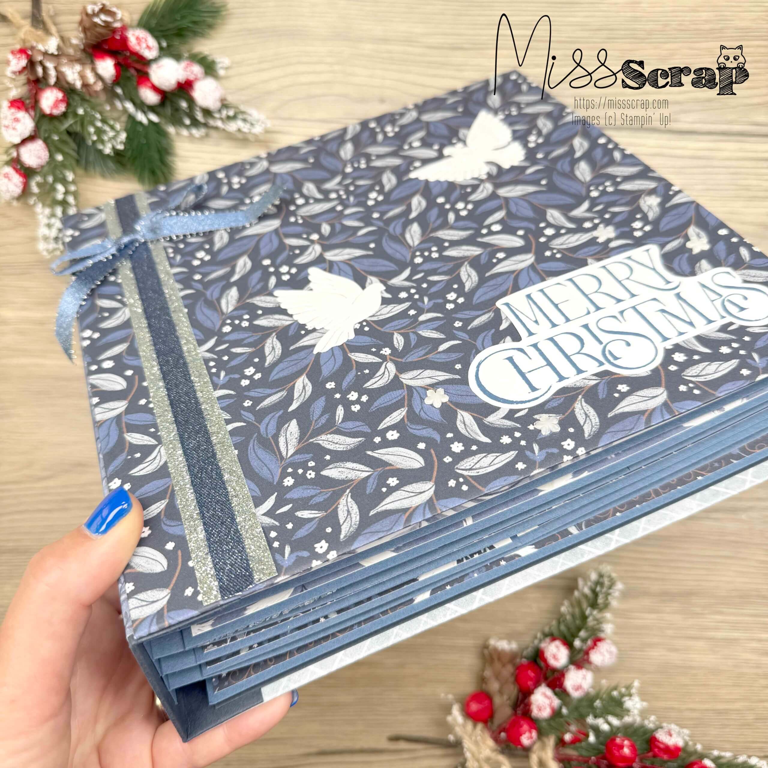Il s’agit d’un album au format 23 x 22 cm, avec une épaisseur de 6 cm; qui a été proposé à l’automne 2025 avec la collection « Jardin Paisible » de chez Stampin’ Up! Il est sur le thème des fêtes de fin d’année mais peut être adapté à toutes les occasions.